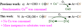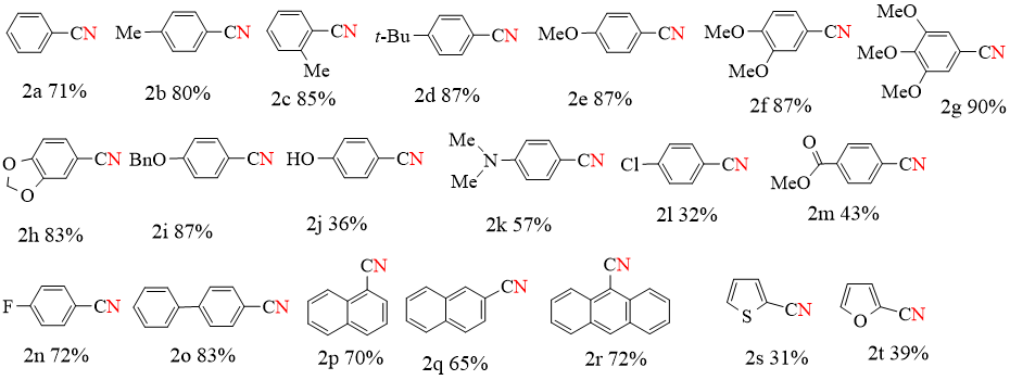 芳腈类化合物广泛应用于天然产物,药物,农用化学品,染料和除草剂中。由于氰基可以容易地转化成各种官能团,因此芳基腈也是合成有机化学中的重要中间体。腈类化合物合成的传统方法包括Sandmeyer反应,Rosnmund–von Braun反应以及醛肟和酰胺的脱水反应。近年来,化学家已经探索了许多用于这种转化的氰化试剂,包括金属氰化物和有机氰基源。从氰化物阴离子到醛的氮转移正在成为合成芳香腈的一种有前途的方法。然而,该方法仍然存在一个缺点,即需要使用化学计量的 Cu(II) 或 Cu(I) 盐来进行反应。