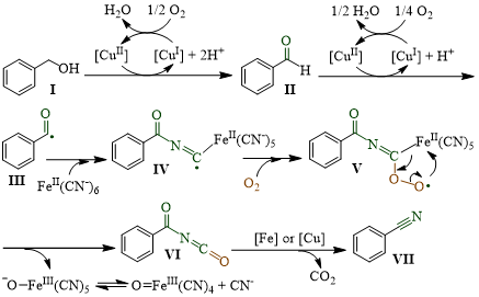 结合上述实验探究,作者提出了可能的反应机理:醇I首先在1,10-菲咯啉/Cu2O的催化下氧化脱氢得到醛II,然后通过单电子转移从Cu催化氧化形成酰基III(已通过自由基捕捉剂实验证明)。酰基自由基 III 与 FeII(CN-)6 反应生成 FeII 键合的以碳为中心的自由基 IV。然后IV和氧分子之间的反应得到苯甲酰异氰酸酯VI。最后,从苯甲酰异氰酸酯 VI 中消除二氧化碳分子,得到苯甲腈产物。