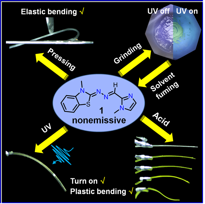 Bet365手机版下载 郑昕博士团队以灵活性的腙键为桥,连接苯并噻唑荧光团和咪唑功能基团,构建了一种新型功能分子。在紫外光作用下,这种分子的细长单晶可以发生快速可逆的塑性机械弯曲运动,并在此过程中伴随着显著的荧光增强(图1)。而在机械外力作用下,此柔性单晶还表现出明显的弹性弯曲。此外,在多种挥发性酸蒸汽作用下,此柔性单晶还可以发生可控的塑性机械弯曲和荧光增强,从而解决了酸诱导机械弯曲过程中晶体会发生荧光猝灭的难题(图2)。