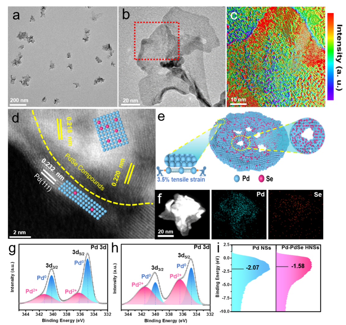 图2. a, b) 不同放大倍数的Pd-PdSe HNSs的TEM图像;c) 取自 (b) 中红色虚线正方形的彩色模拟图;d) Pd-PdSe HNSs的球差电镜图片;e) Pd-PdSe HNSs结构示意图;f) Pd-PdSe HNSs的HAADF-STEM和EDS映射图像;(g) Pd NSs和 (h) Pd-PdSe HNSs的Pd-3d XPS谱;i) Pd NSs和Pd-PdSe HNSs的表面价带谱。