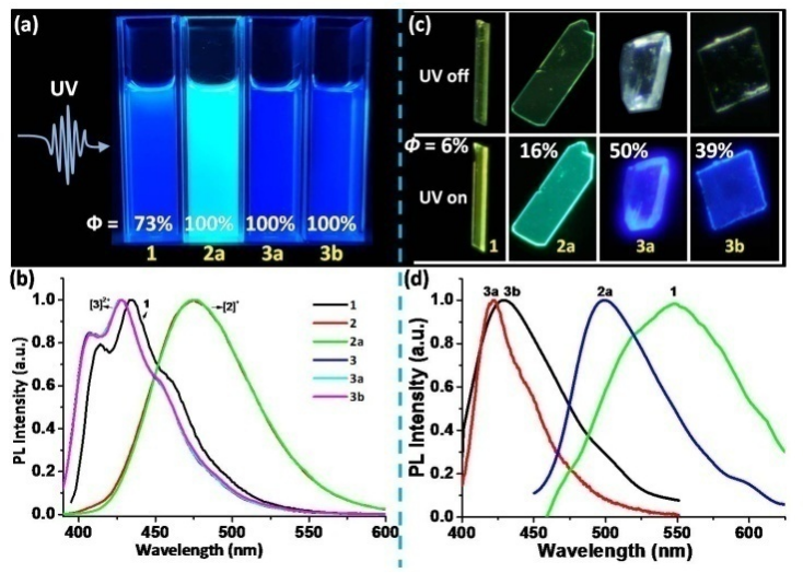 团队利用X-射线单晶结构分析化合物,并结合理论计算,揭示了晶体中离子间CH····F氢键导致的扭曲是使咪唑盐能够发出显著的荧光的主要原因。共轭和分子间π-π相互作用限制分子内旋转(RIR)使化合物1的荧光具有相当强度。N-烷基化逐渐增加咪唑亚基和TTz核之间的键长,同时增加分子扭曲并降低π-共轭程度,从而增加分子柔韧性并降低3的固态荧光强度。离子盐3a和3b在固态下的强荧光可归因于离子间CH····F氢键诱导的扭曲和刚性结构。结果表明,扭曲的刚性阳离子结构和合适的反阴离子可能对开发高双态发射材料和良好的水溶性起到关键作用。