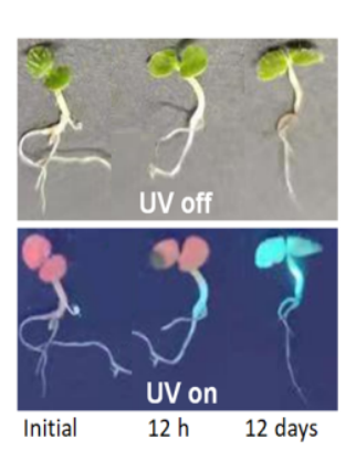 -5mol/L),以此为培养液,用来监测泡桐幼芽的生长。经过12小时培养,发现泡桐芽的根茎具有明显的蓝色荧光,经12天培养,发现泡桐幼芽的根茎和叶片上都具有明显的蓝色荧光,且泡桐幼芽生长良好,证明化合物1具有低毒性,可以用来监测植物的生长。