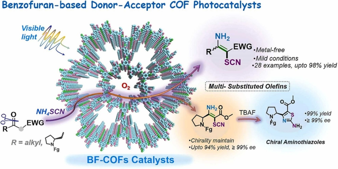 这项工作不仅证明了富含电子的芳香环和杂轴烯单元通过互变异构可以形成供体-受体结构,而且还为 (手性) 多取代烯烃和手性氨基噻唑的绿色合成提供了新的策略。同时,由于功能单体的可调性和COFs的结构特点,以BF-COFs等为代表的COF材料将为多相光催化剂的开发及精细化学品的高效合成带来新的机遇。