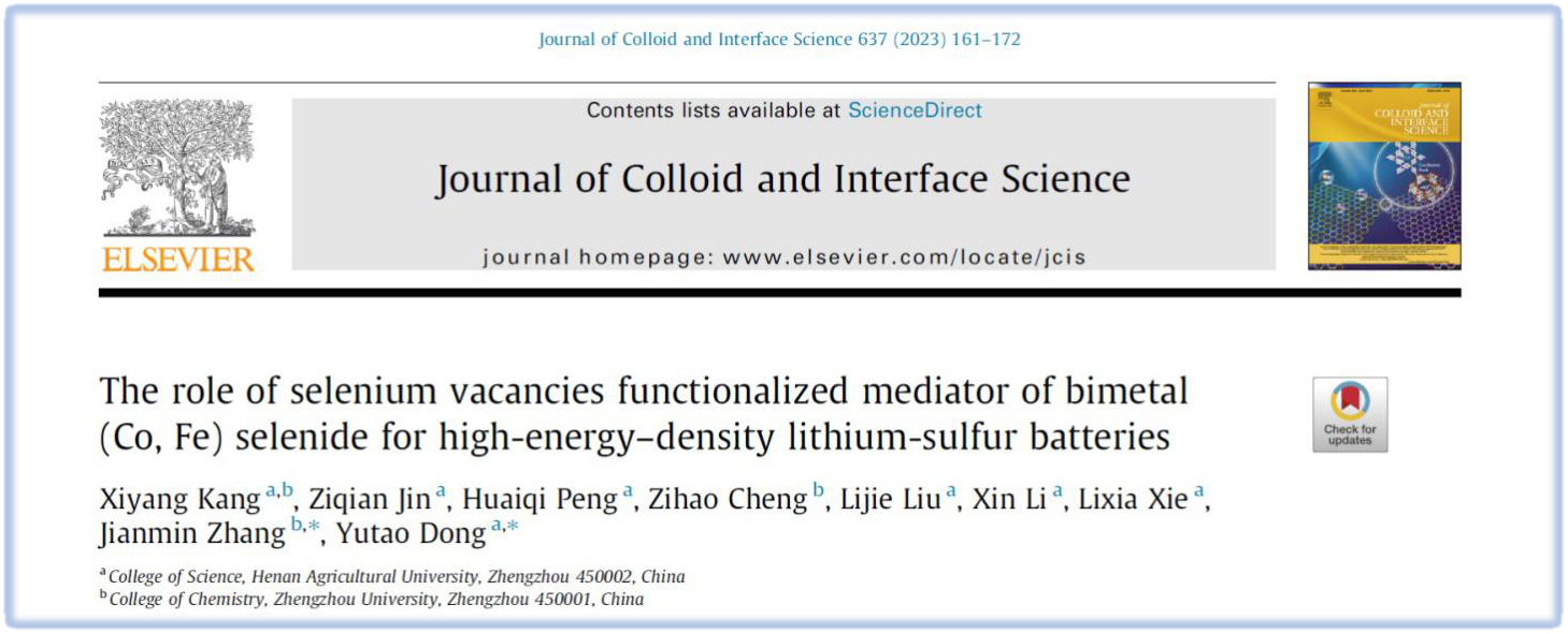该研究成果以“The role of selenium vacancies functionalized mediator of bimetal (Co, Fe) selenide for high-energy-density lithium-sulfur batteries”的论文形式在线发表在期刊Journal of Colloid and Interface Science上。该研究由董玉涛教授团队和郑州大学张建民教授团队合作完成,河南农业大学为第一通讯单位,得到了河南农业大学拔尖人才(No. 30501035)及河南省科技攻关(No. 212102210586)等项目的支持。
