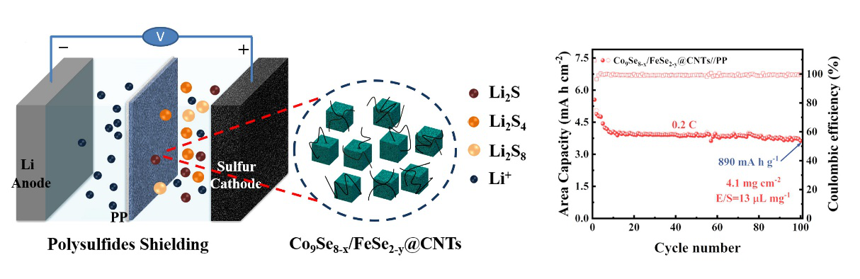 校聘教授董玉涛科研团队在锂硫电池储能领域取得新进展。该研究以类普鲁士蓝为前驱体,采用氩/氢还原法简易构筑了具有硒缺陷的三维网络结构双金属硒化物/碳纳米管复合材料(Co