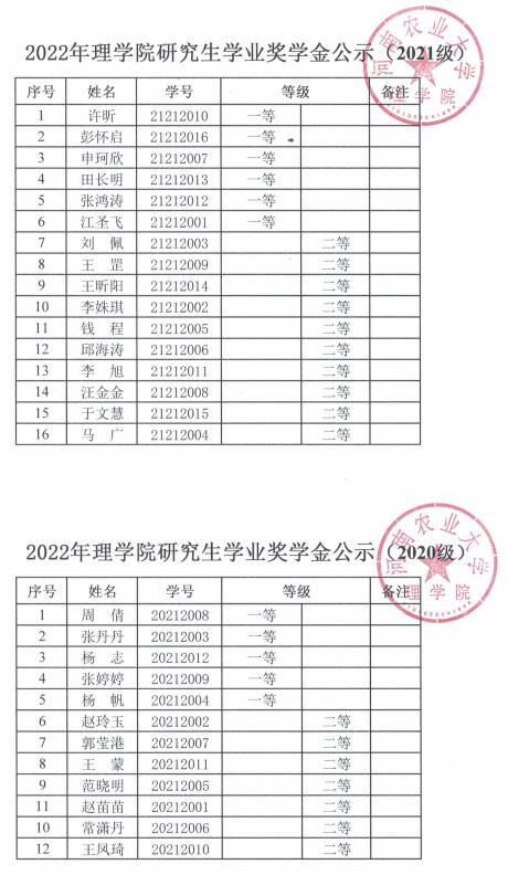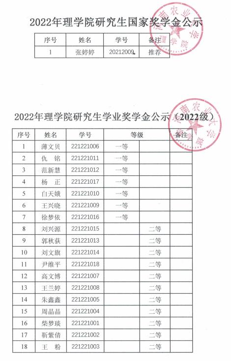 根据《河南农业大学研究生奖助学金管理办法》(校政研〔2018〕11号)文件和《关于开展2022年研究生奖助学金评定工作的通知》精神,按照《Bet365手机版下载 2022年研究生奖学金评定细则》的规定,现将研究生奖学金评审结果予以公示。