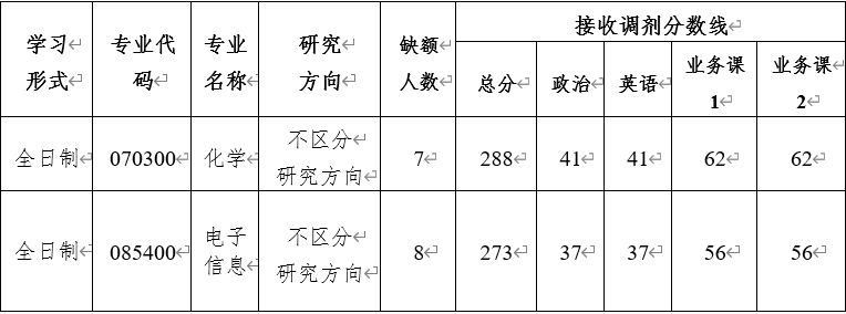 其中化学(070300)学术学位硕士仅接收第一志愿初试统考科目为:101思想政治理论和201 英语(一)考生调剂;电子信息(085400)专业学位硕士仅接收第一志愿初试统考科目为:101思想政治理论、201 英语 (一)或204 英语(二)、301数学(一)或302数学(二)考生调剂。