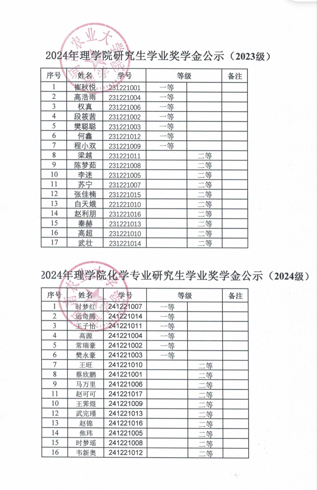 根据《河南农业大学关于做好2024年研究生国家奖助学金评审发放工作的通知》和《河南农业大学研究生奖助学金管理办法》(农大研〔2024〕3号)文件精神,按照《Bet365手机版下载 2024年研究生奖学金评定细则》的规定,现将研究生奖学金评审结果予以公示。