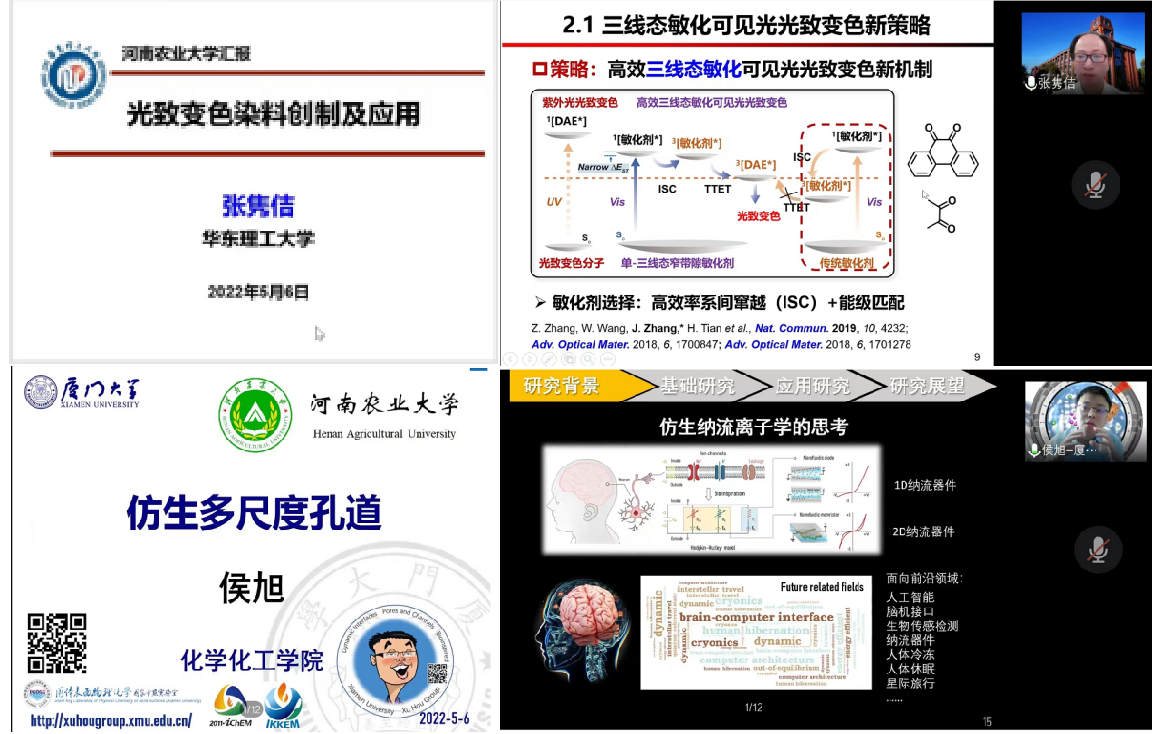 张隽佶副教授作了题为《光致变色功能染料及生物应用研究》的报告。报告主要围绕可见光光致变色分子构建、光致变色染料生物应用等方面开展。张隽佶团队关注产业和学术业共同关心的方向,通过解决传统方案中稳定性差、开发风险高的问题,提出了新的策略和思路:(1)创新提出“三线态敏化”光致变色新机制,实现染料可见光激发与光控性能的协同提升;(2)发展“砌块化”分子设计方法,实现可见光光致变色染料的高效构筑与制备;(3)构建超分辨成像“光控探针”,探索光致变色染朴生物新应用。