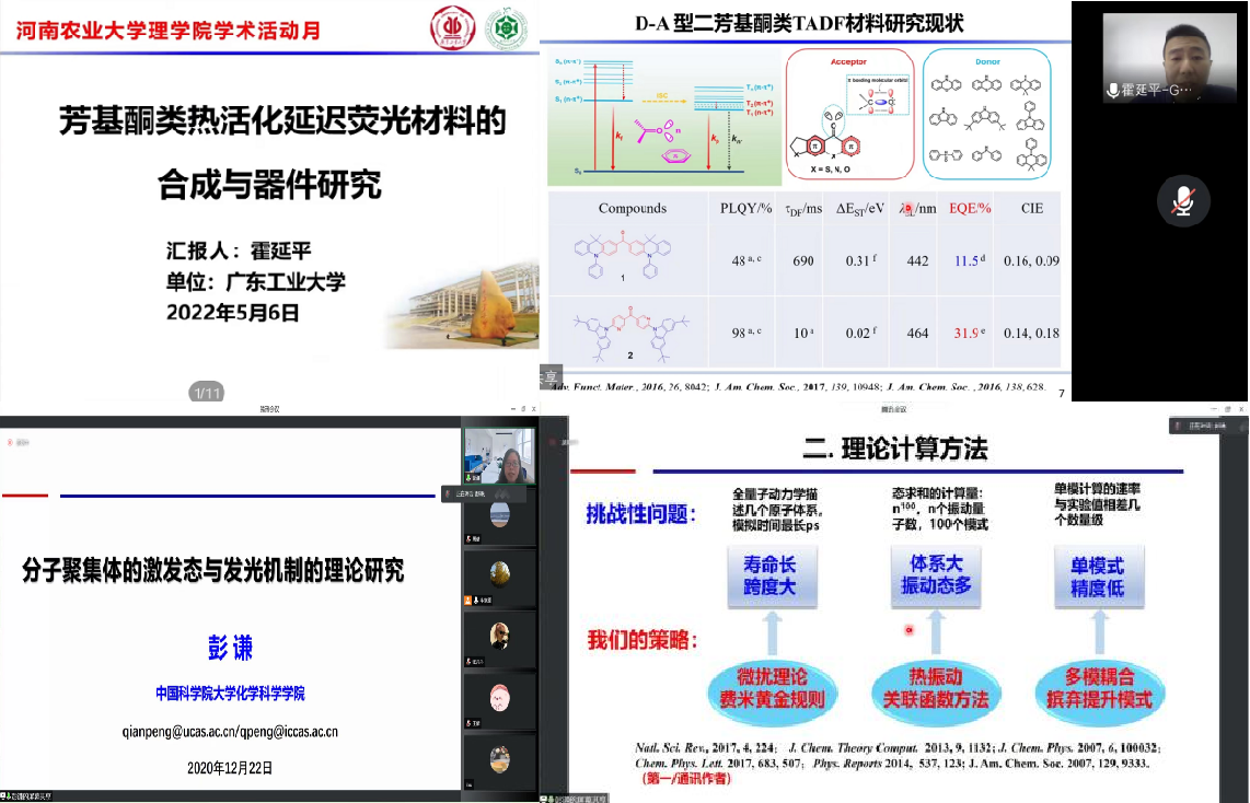 中国科Bet365手机版下载 大学彭谦教授带来了题为《分子聚集体激发态与发光机制的理论研究》的报告,他介绍一种普适的有机分子激发态过程的速率理论及计算方法,并应用该方法阐明新型有机聚集体的发光机制,例如聚集诱导荧光、聚集诱导热激活延迟荧光、纯有机室温磷光等。同时,基于发光机制,建立有机材料分子结构-性能关系,提出高发光效率的有机发光材料分子的设计策略。