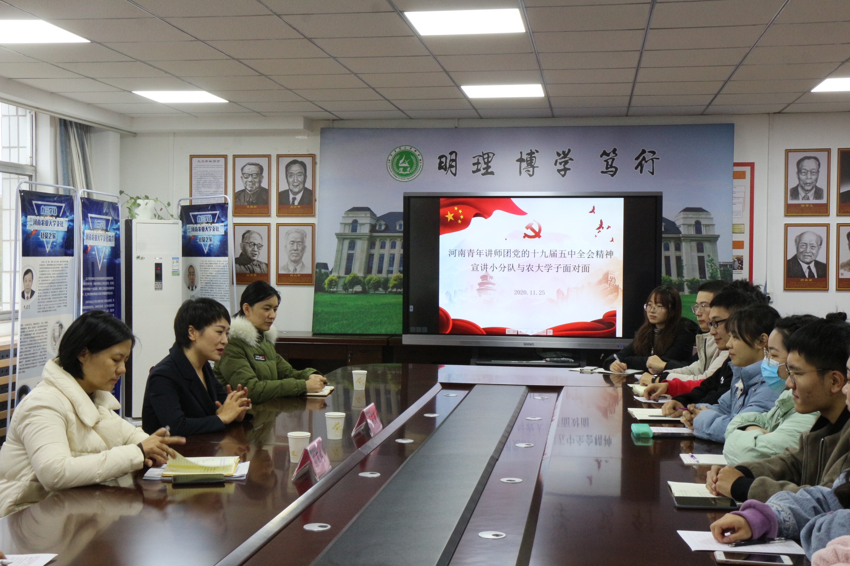 2020年11月25日,河南青年讲师团成员张晓静深入河南农业大学宣讲党的十九届五中全会精神,在文化路校区20号楼415会议室同Bet365手机版下载