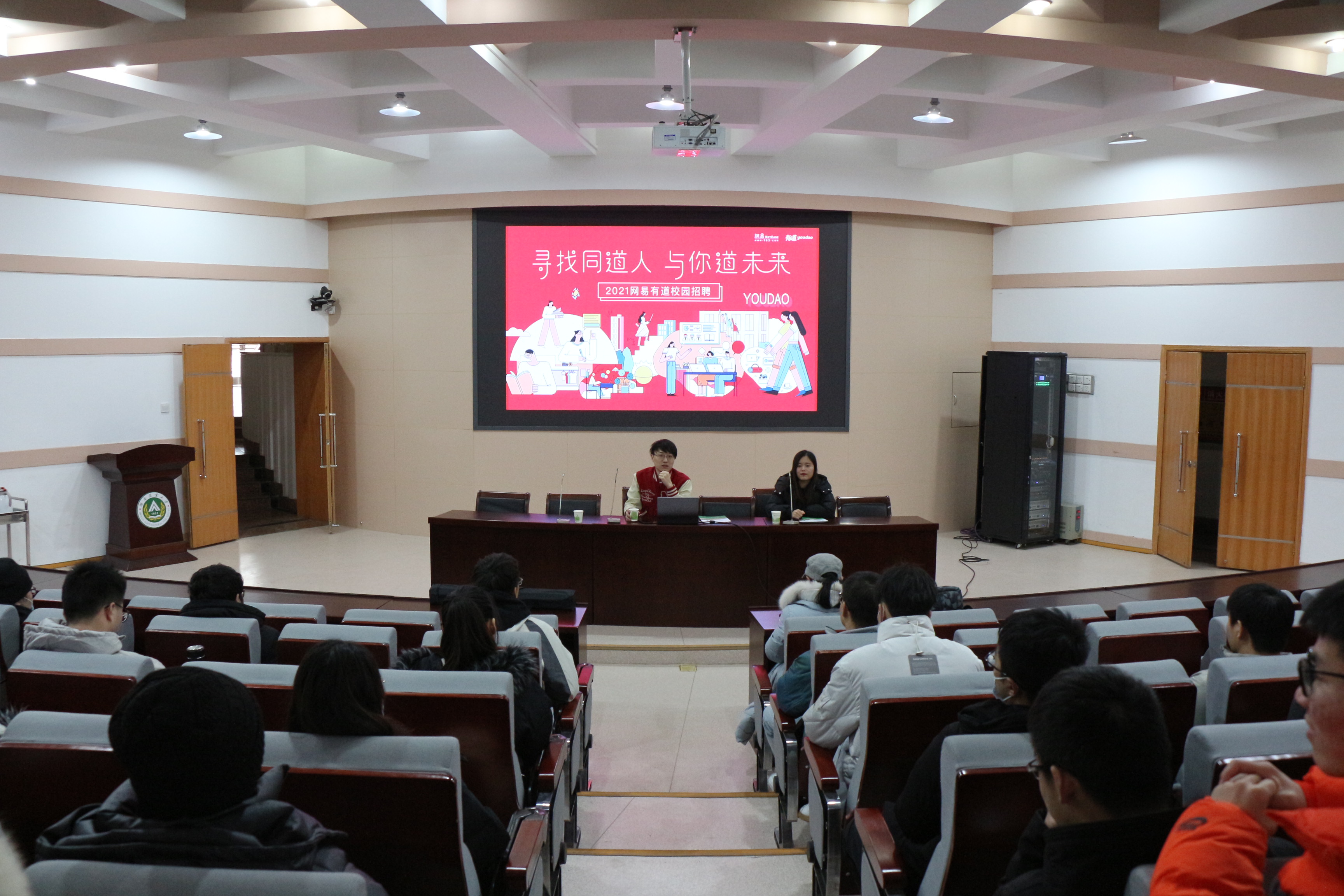 会上,网易有道精品课负责人从服务领域、服务对象、教育培训产品、市场分析和未来发展方向等多角度向毕业生介绍了网易有道精品课。随后,他从成员组成、工作内容和分工明细等方面介绍了网易有道精品课的团队阵容和企业工作的薪酬福利与职业发展途径。讲解结束后,他对毕业生提出的问题进行逐一解答。邓瑛指出,毕业生要正确认识社会与学业的密切联系,充分利用校招渠道,了解前沿企业的有关信息,为未来就业做好准备。