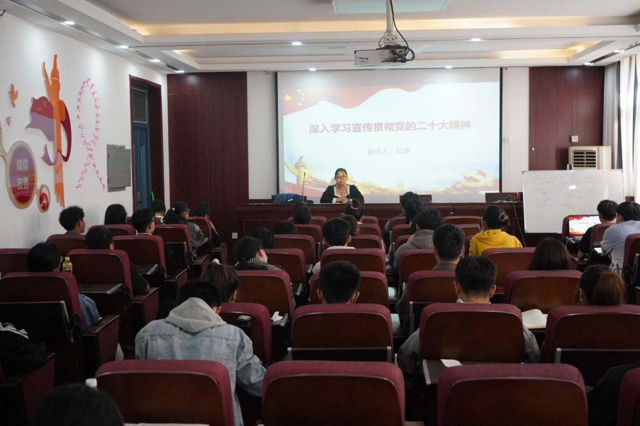 宣讲会上,邓瑛以“深入学习贯彻党的二十大精神”为主题展开宣讲,引导学生深刻领悟“两个确立”的决定性意义,增强“四个意识”、坚定“四个自信”、做到“两个维护”,鼓励大家自觉把思想和行动统一到党的二十大精神上来。随后,她从五年来党的工作历程与新时代十年发展造就的伟大变革展开,强调马克思主义中国化与时代化的必要性,并从全面建设社会主义现代化国家,坚持党的全面领导和从严治党以及如何应对风险和挑战等方面深入讲解了二十大精神的主要内容,呼吁大家以高度的政治责任感和历史使命感掀起学习宣传贯彻党的二十大精神热潮,紧跟习近平总书记,奋进新征程、建功新时代。