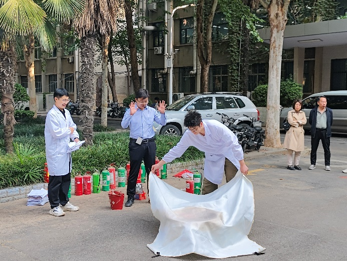 演练正式开始前,曹占奇老师讲解了有关火灾现场的应急处置方案,灭火器、灭火毯及防毒面具的使用原理以及相关的注意事项,并亲自演练了使用方法。在认真听讲及观摩后,学生们亲自体验了灭火的过程,面对熊熊燃烧的火堆,学生们表现十分沉着,通过使用灭火毯、灭火器等熟练地将火迅速扑灭,做到了冷静沉着的面对突发现象,成功快速的扑灭大火的消防标准。