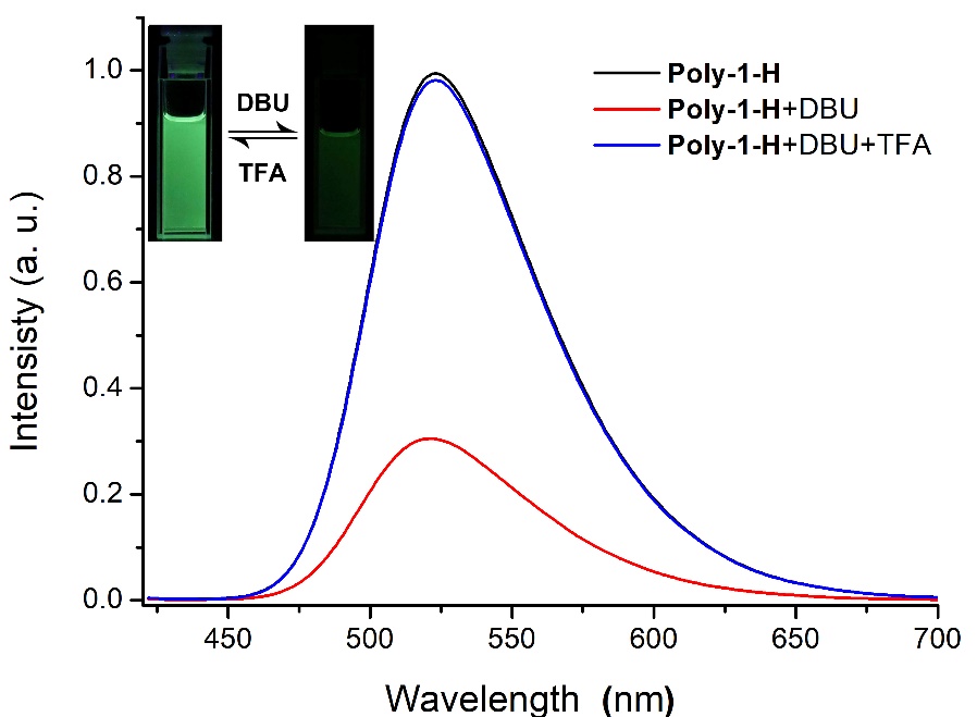 拓扑结构变化广泛存在于自然界中,例如DNA 具有双螺旋结构,当生命活动涉及到DNA 的转录、翻译以及折叠等过程,就会伴随着拓扑结构的转变。由于环型拓扑结构的聚合物没有末端,与线型或支化拓扑结构的聚合物相比,在结构以及理化性质等方面大相径庭,在微电子、生物医药、环境处理以及高性能材料方面取得了极具特色的应用。但是由于合成以及纯化困难,使得创造新的环型聚合物仍是一项不小的挑战并限制了其大范围的应用。作者采用一种只需简单酸碱刺激就可驱动聚合物微观拓扑结构发生宏观肉眼可视变化的策略来制备环型聚合物。作者在[1]轮烷分子梭的杆状骨架上引入柔性聚四氢呋喃链,设计并制备基于双稳态[1]轮烷分子梭的线型-环型拓扑结构可逆转变聚合物。聚合物的两端分别引入二茂铁功能化的[1]轮烷和绿色荧光的萘酰亚胺基团,分子内能够表现出距离诱导的光致电子转移作用(图5)。通过简单的酸碱刺激,双苯并24冠8大环在二苄铵和甲基三氮唑两个不同识别位点穿梭,发生肉眼可见的荧光强度变化(图6),证明聚合物发生线型和环型拓扑结构转变。这项工作为构建具有拓扑结构的环型聚合物提供了一种新的策略。(Chin. Chem. Lett., 2022. 33, 1533-1536)