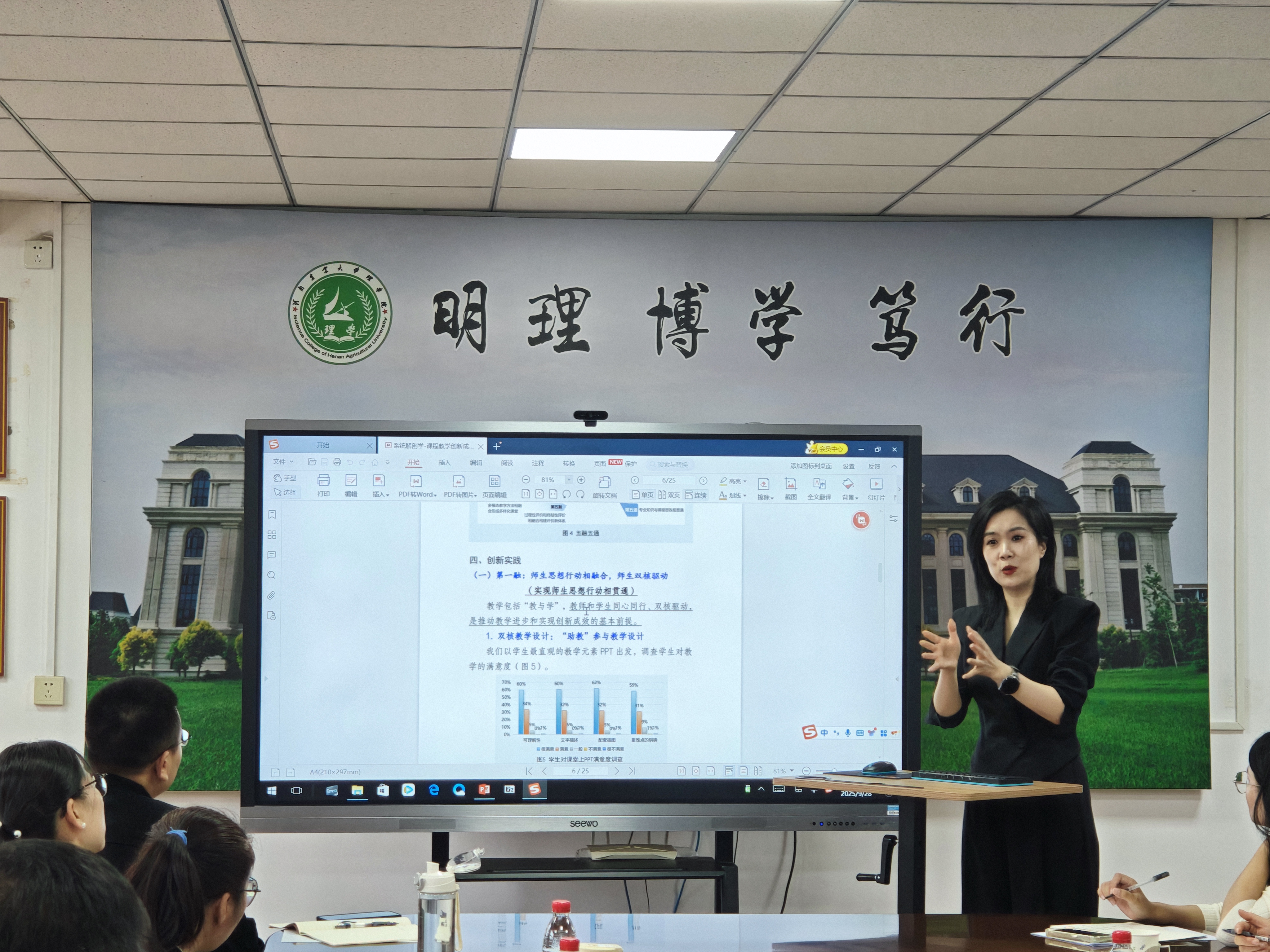 刘锦老师结合自身丰富的教学实践与参赛经验,围绕课程简介与学情分析、痛点问题梳理、创新思路凝练、创新实践路径及团队特色优势与成果等方面,系统阐述了教学创新的核心要素与实践策略。她强调教学创新要注重以学生为中心,立足学科特点,聚焦教学实践的真实“问题”,建设有温度的课堂,运用教学实验研究的范式解决教学问题。会后,参会教师们就课堂教学的创新举措、具体实践与改革难点等,同刘老师进行了深入探讨与交流,刘老师的精准指导与宝贵建议,使教师们收获丰硕,受益匪浅。