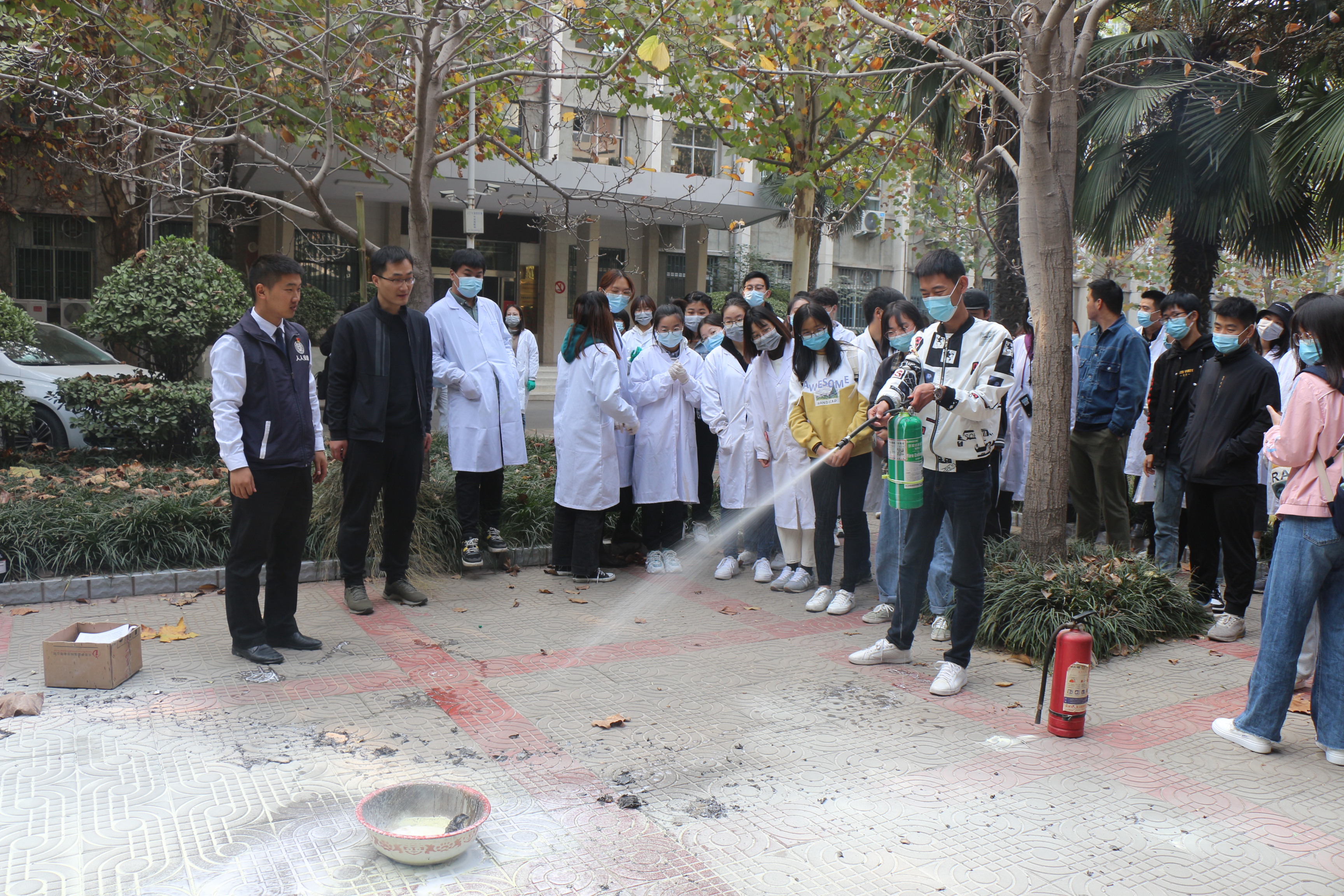 讲座结束后,武甲好带领学生前往室外进行消防演练,向同学们详细讲解如何高速有效地使用灭火器熄灭火种;讲解结束后,同学们积极上前按照所学知识使用灭火器进行演练。最后,徐向楠希望同学们重视,安全牢记消防知识,消除安全隐患,避免火灾发生。
